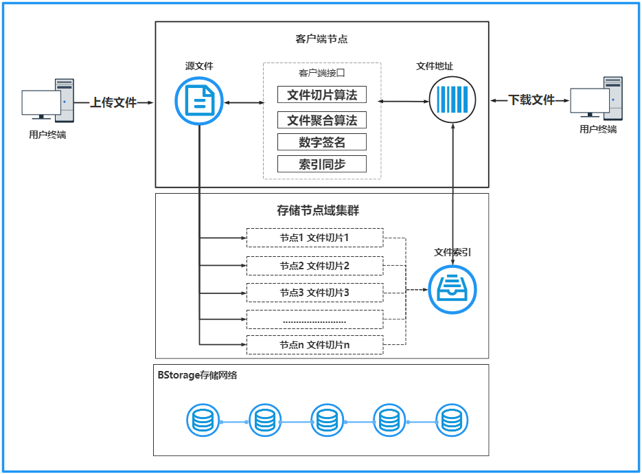 系统将用户上传的数据文件分片成小块,分配给参与的节点来进行存储,平台将分布在不同区域的客户端节点贡献出来的闲置计算能力组成庞大的分布式网络,通过一定的规则,把指派任务分散打包成微小任务,同时有数以万计的计算资源供完成任务使用。在任务指派过程中,通过激励账本算法计算奖励值,并按照节点贡献分配奖励。