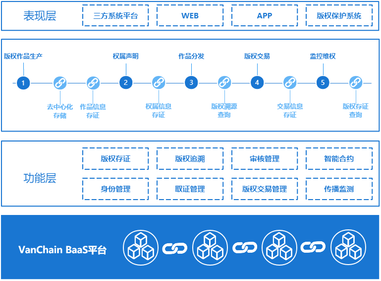 锋链区块链版权保护系统基于VanChain BaaS平台为底层架构搭建。VanChain BaaS的高性能以及高安全性特性为锋链区块链版权保护系统赋能。系统覆盖版权保护链条全部环节,用户可基于自身系统情况进行功能和特性定制化。通过本系统,版权方可大幅降低维权成本,降低维权难度,监管方也可大幅降低监管难度。
